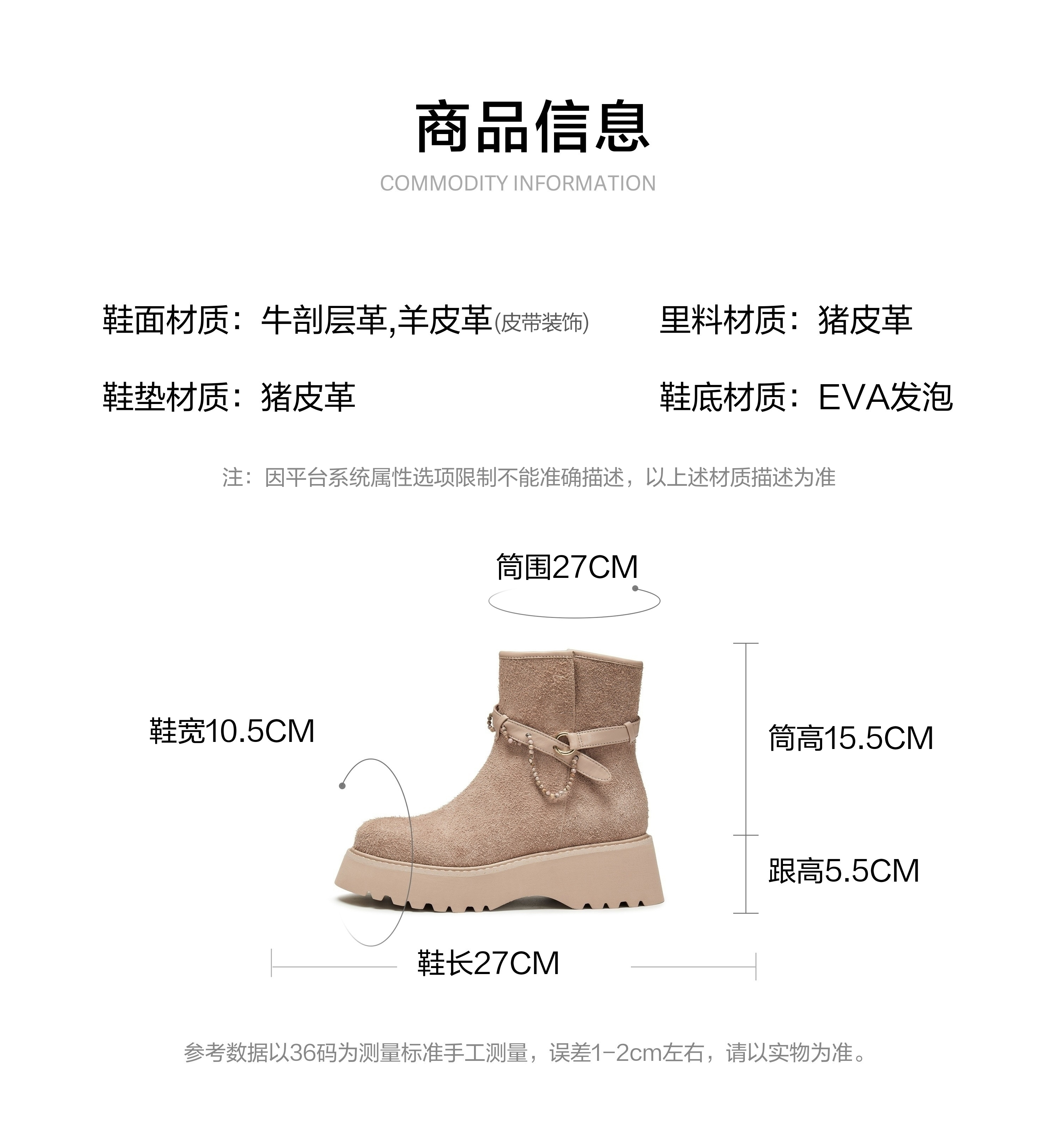 | 筒高数值:15.5CM | 靴筒筒面材质:羊皮革牛剖层革 | 里料材质:猪皮革 | 制鞋工艺:车线胶粘 | 鞋垫材质:猪皮革 |