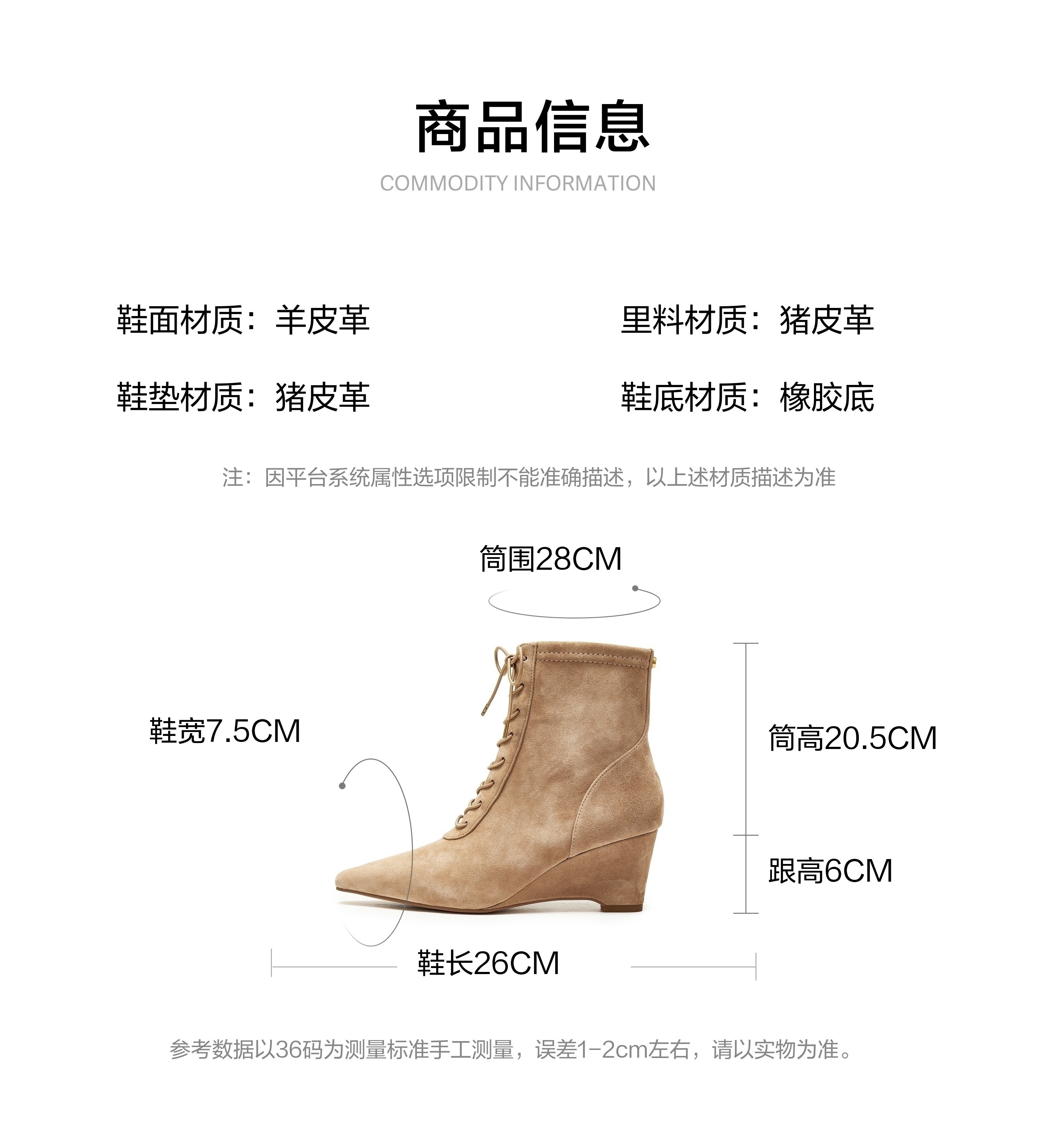 | 参考鞋宽(女):7.5CM | 鞋面内里材质:猪皮革 | 色系:杏色 | 跟高数值:6CM | 筒高数值:20.5CM |