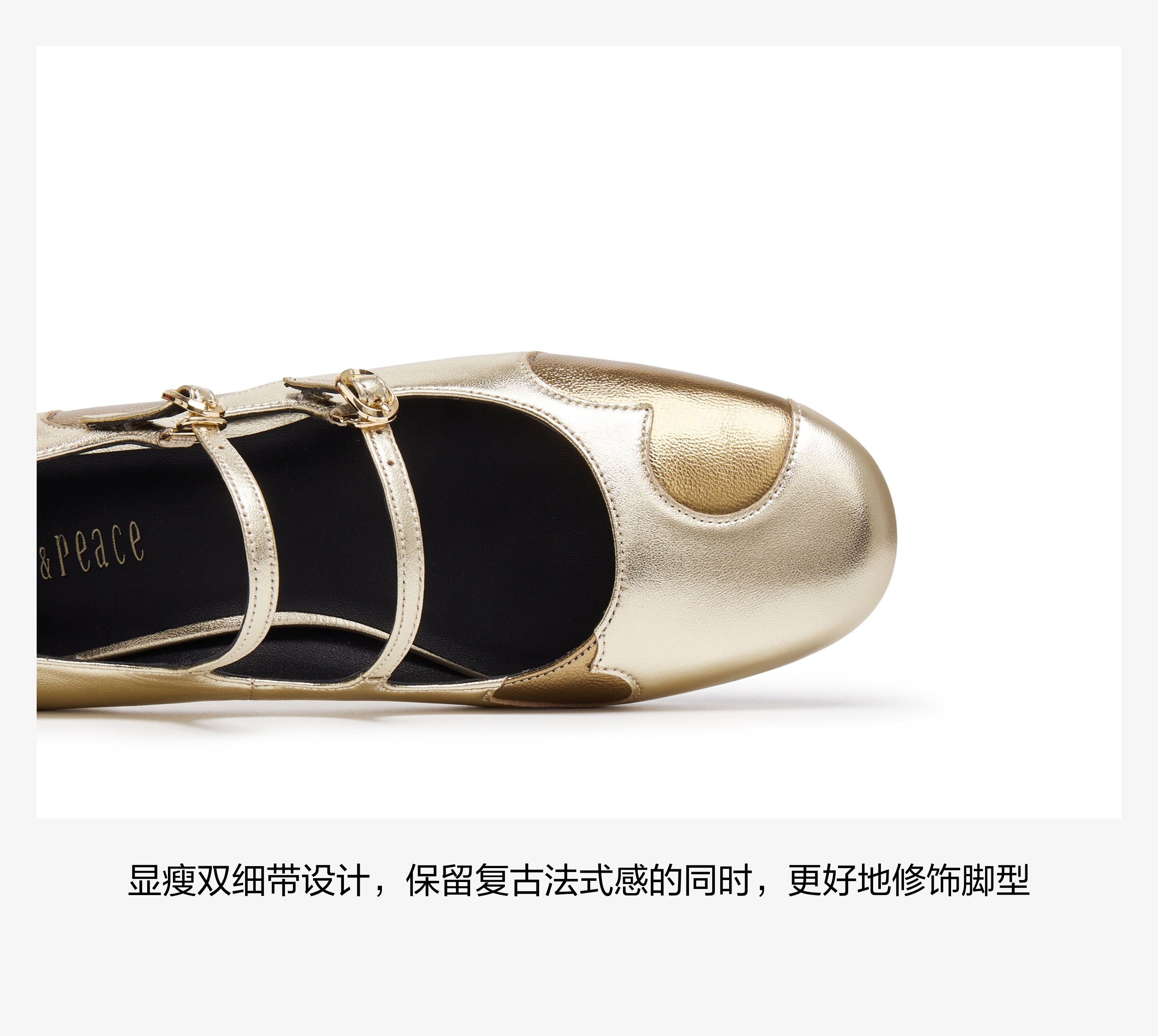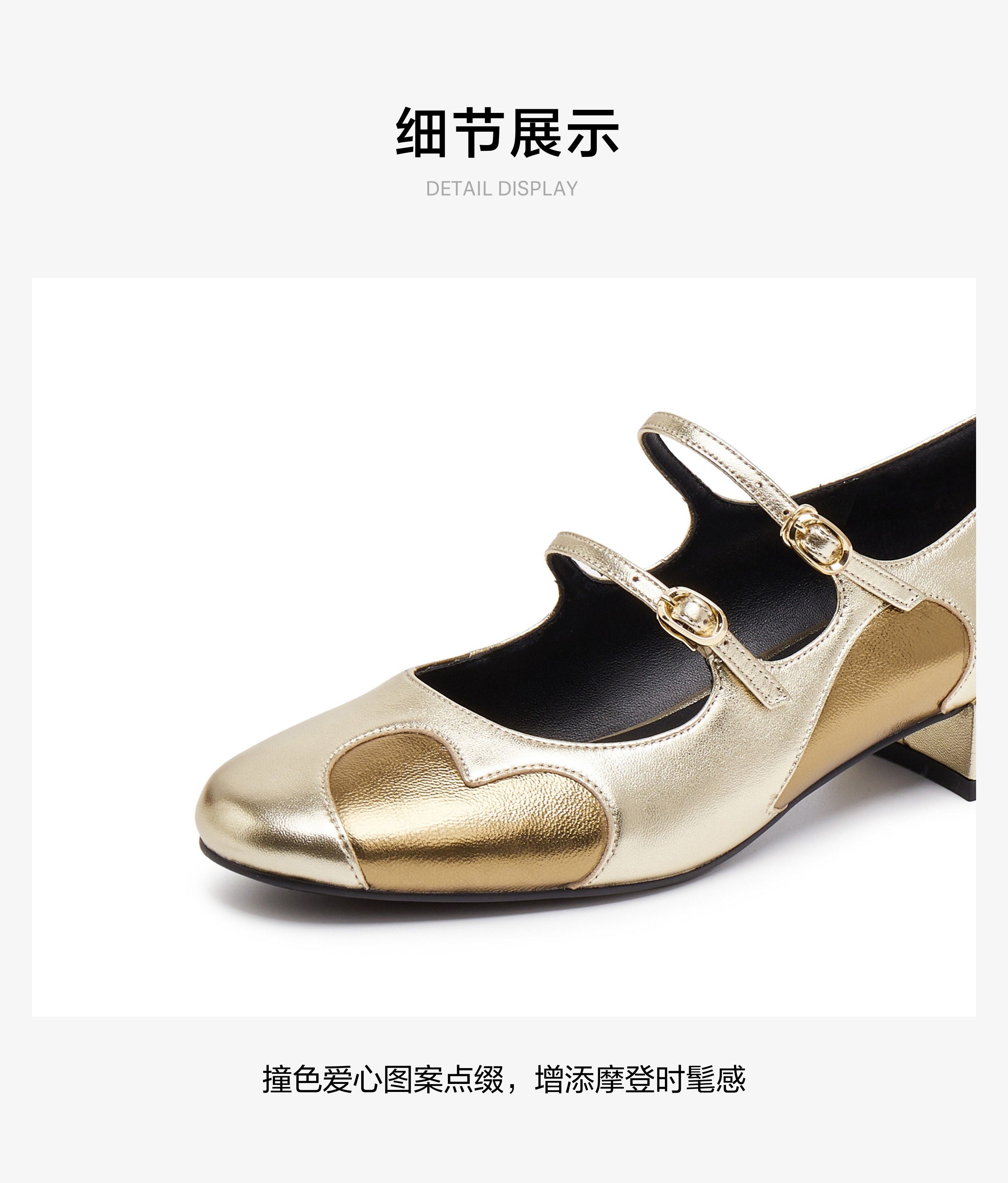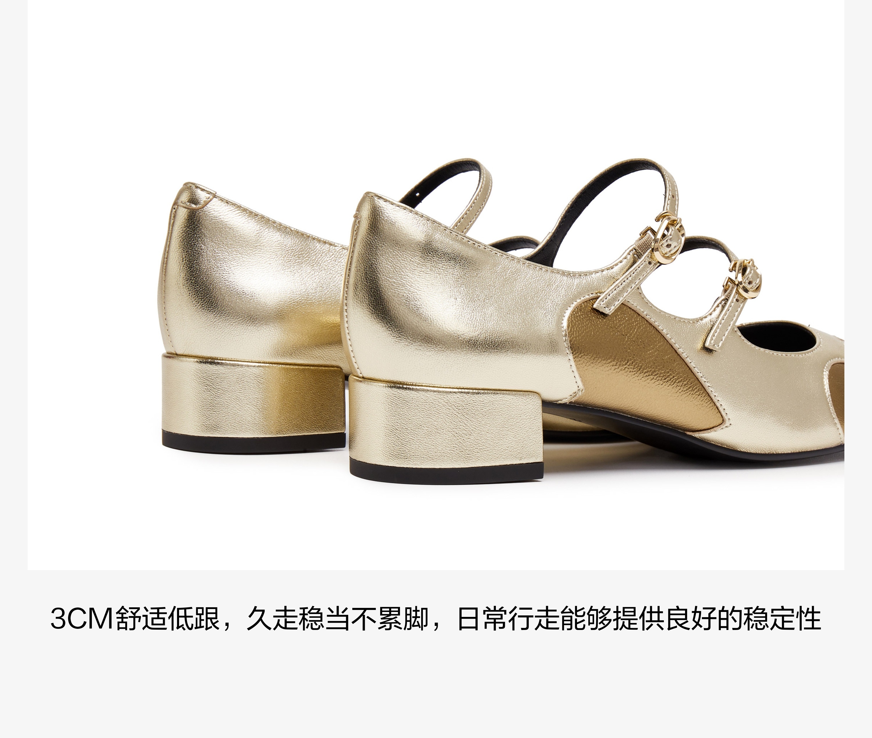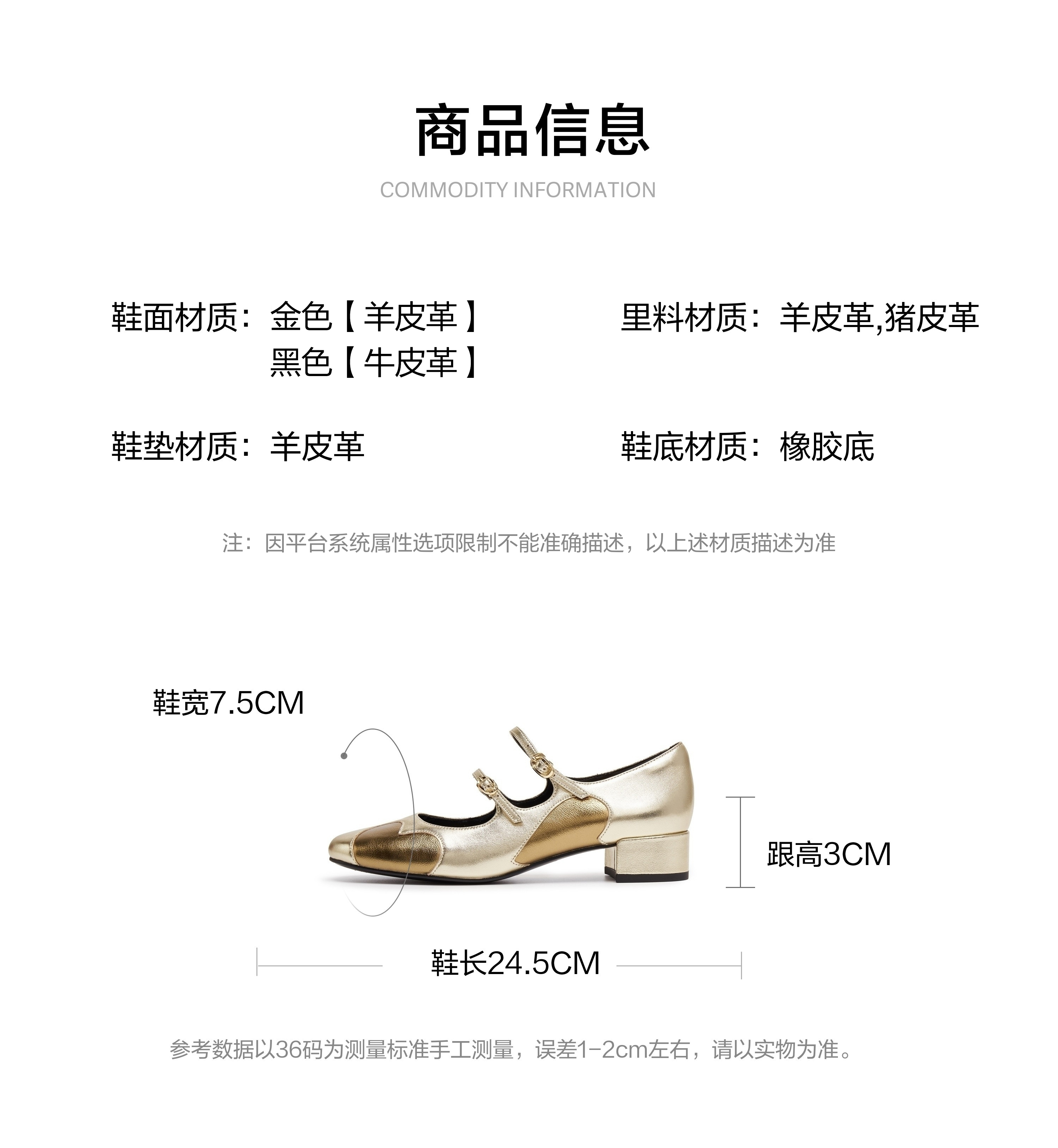| 鞋面内里材质:猪皮羊皮革 | 色系:金色 | 跟高数值:3CM | 配跟:无 | 性别:女子 |