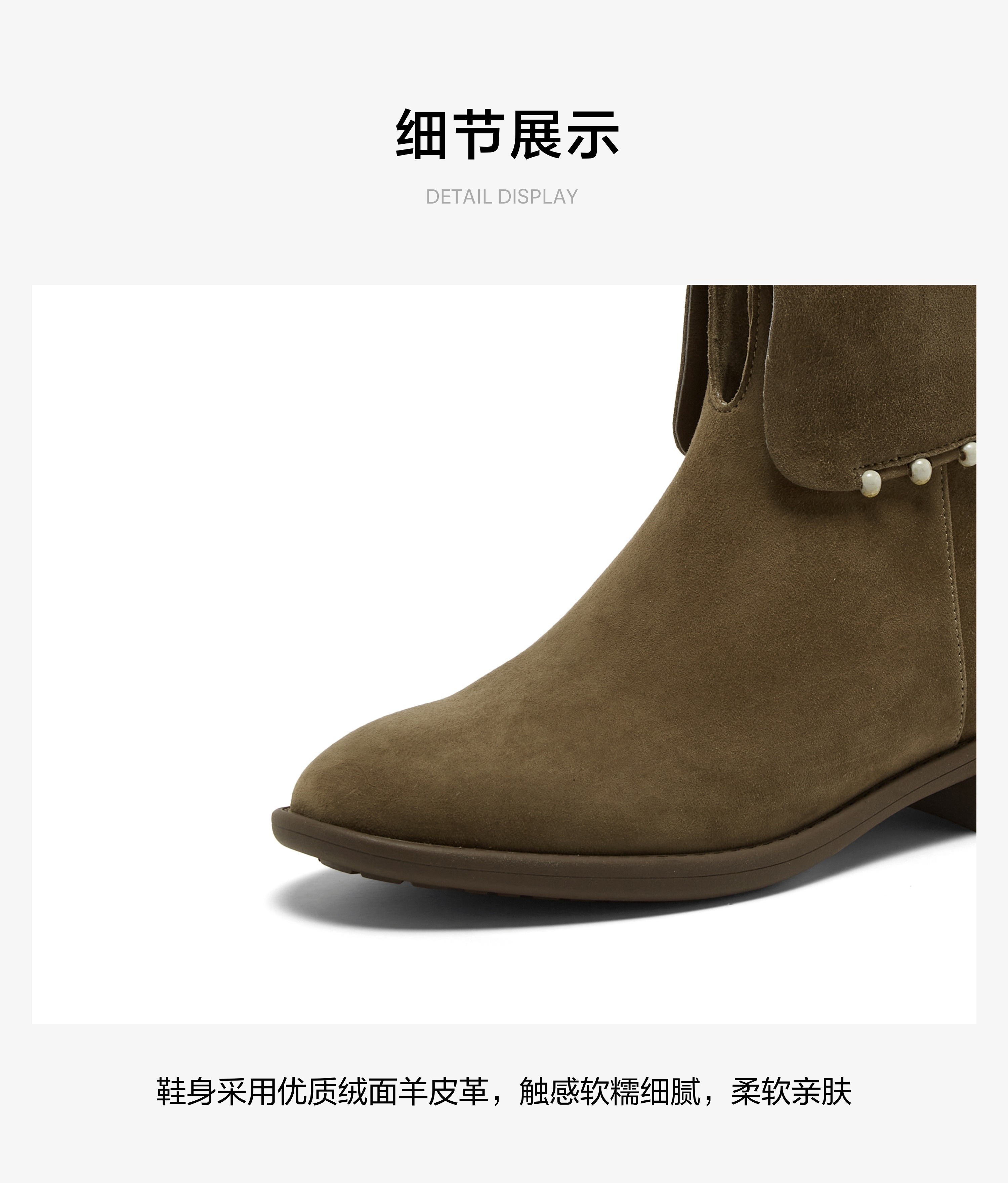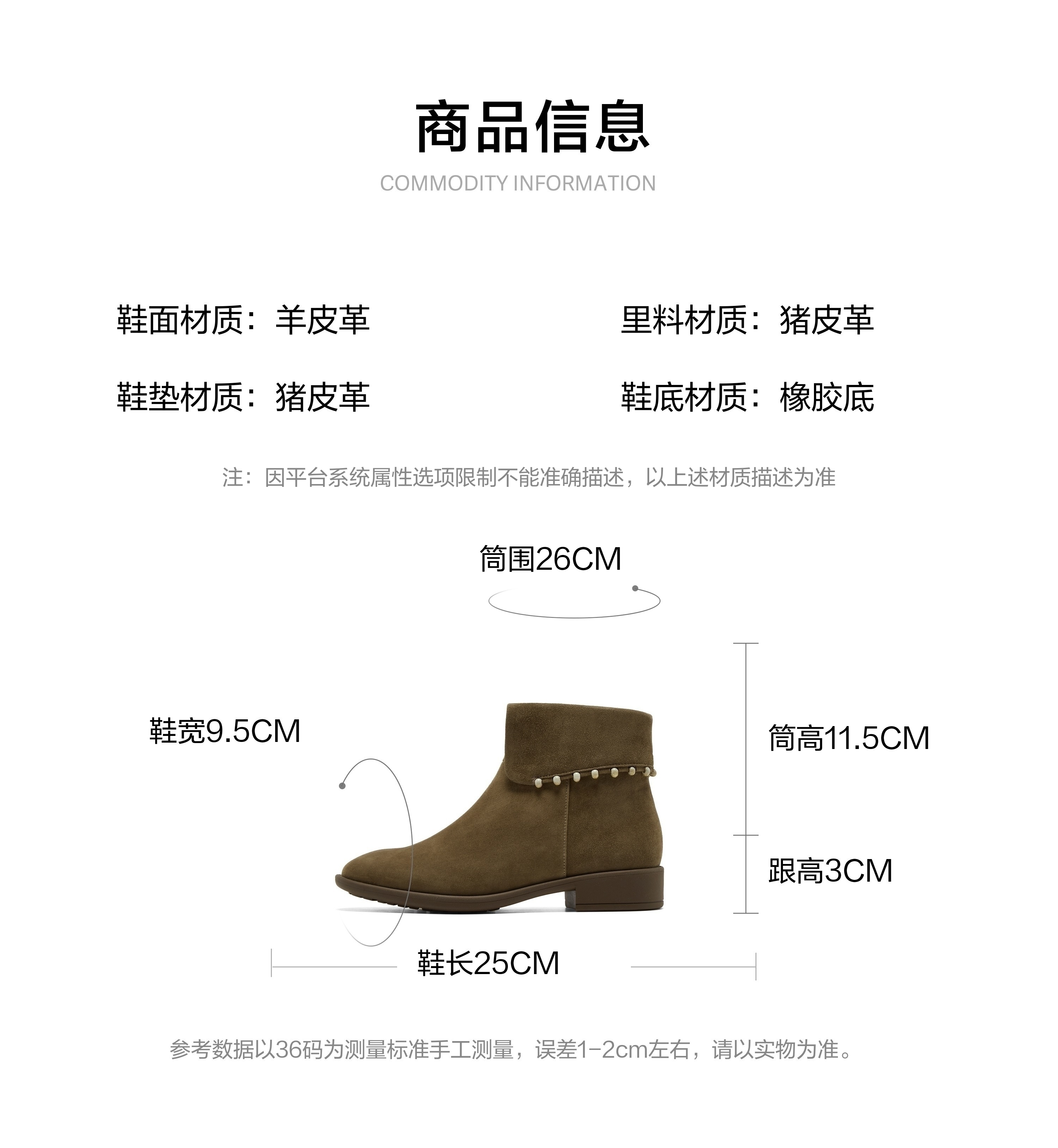 | 筒高数值:11.5CM | 性别:女子 | 靴筒筒面材质:羊皮革 | 里料材质:猪皮革 | 制鞋工艺:车线胶粘 |