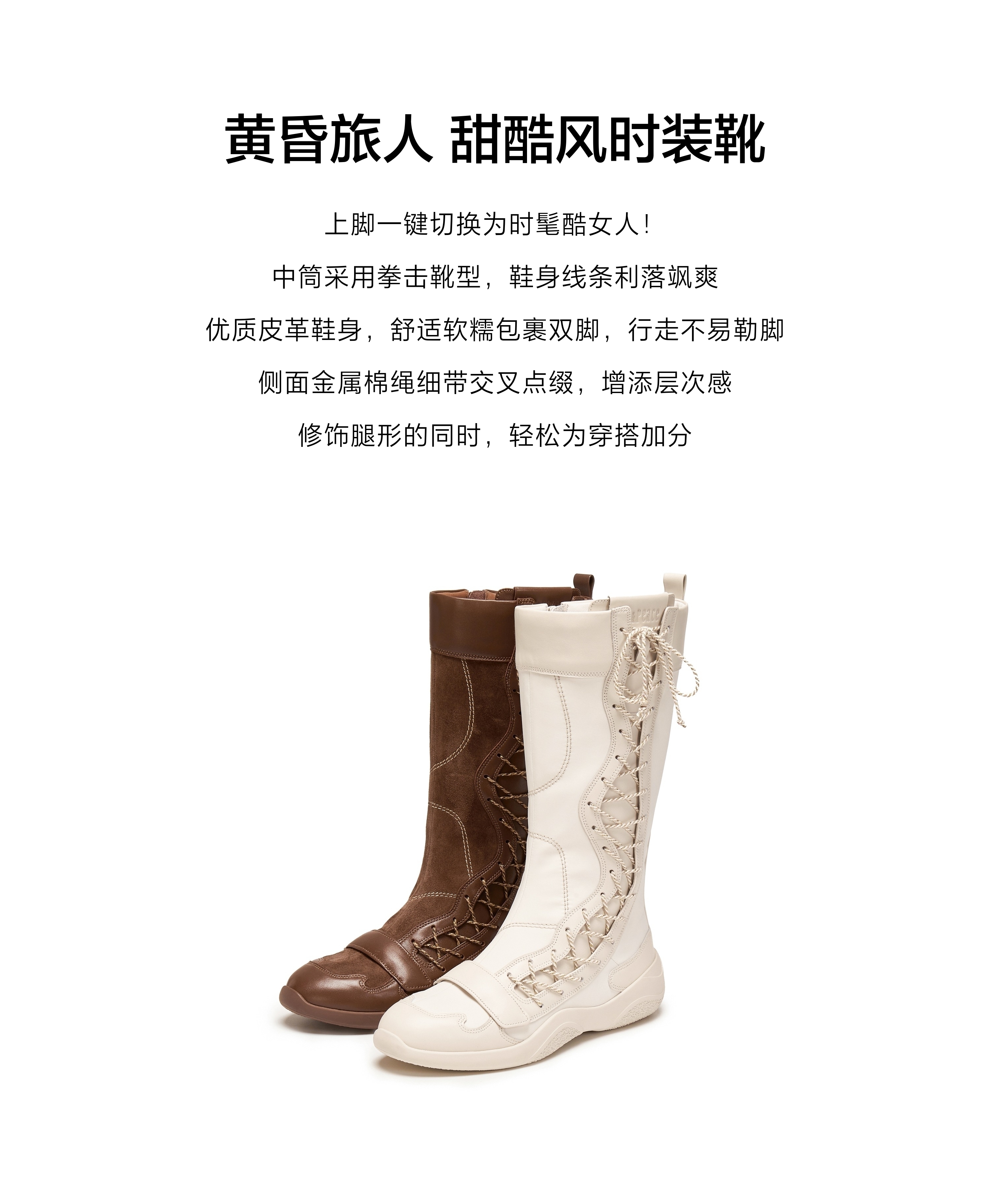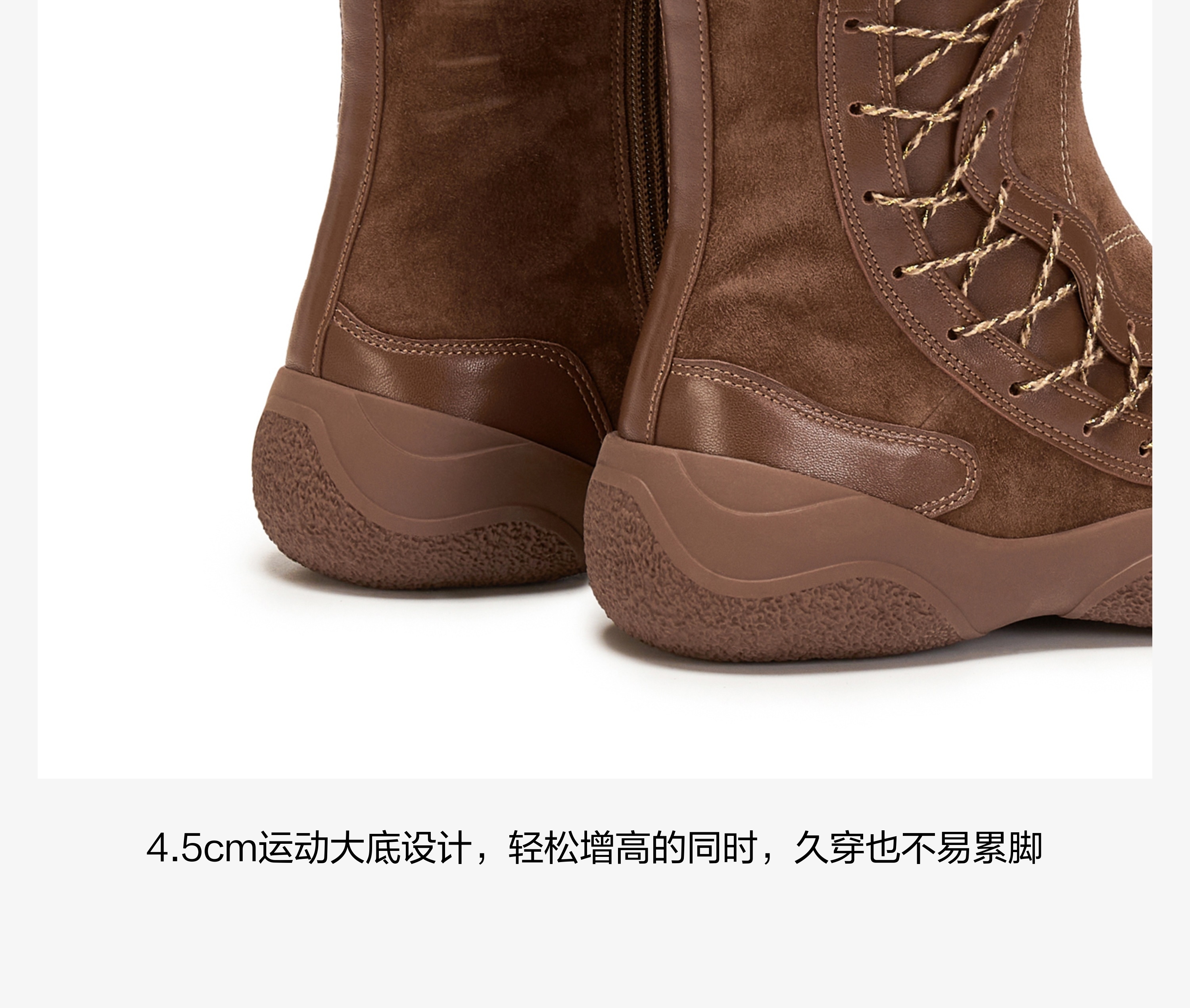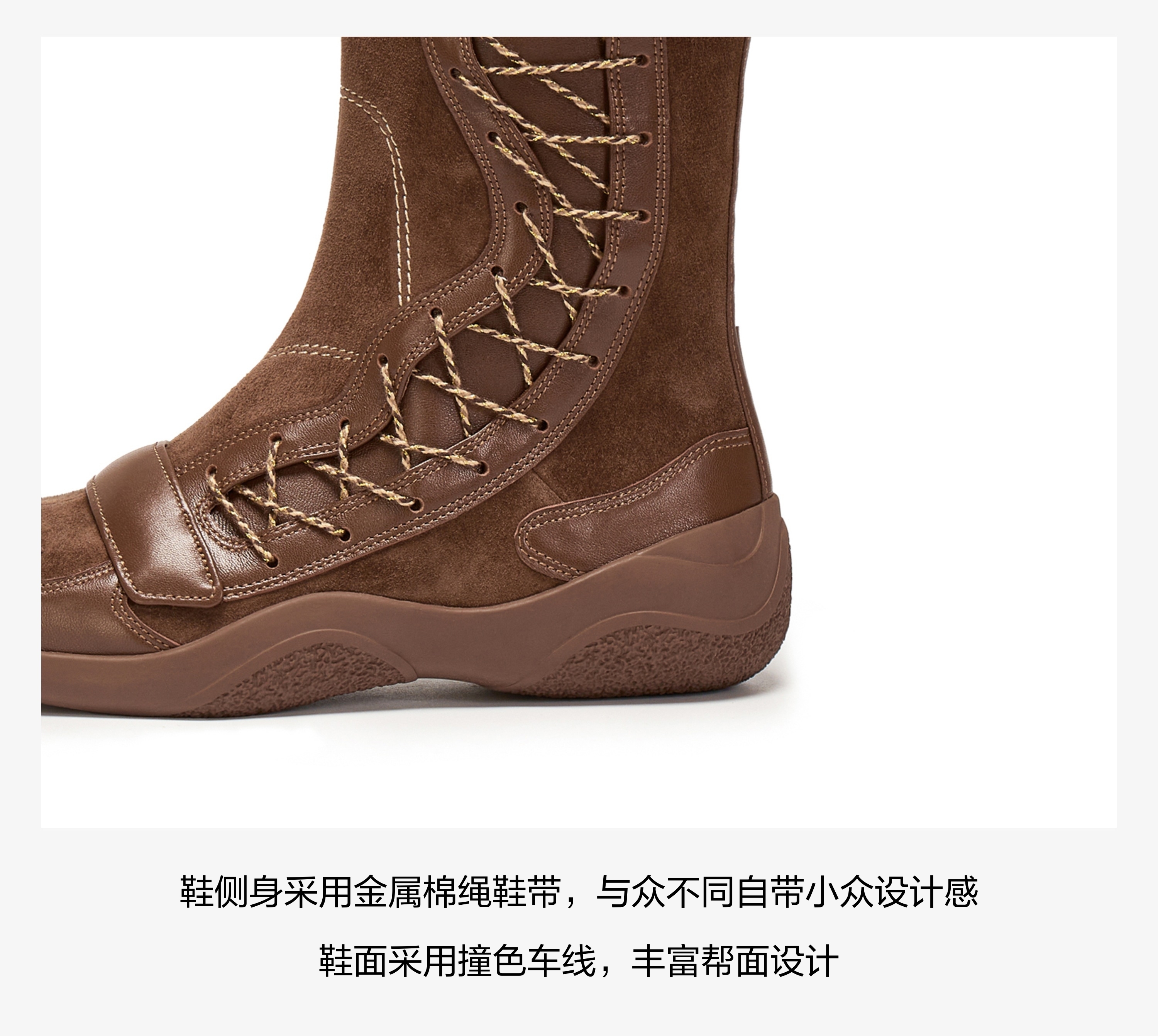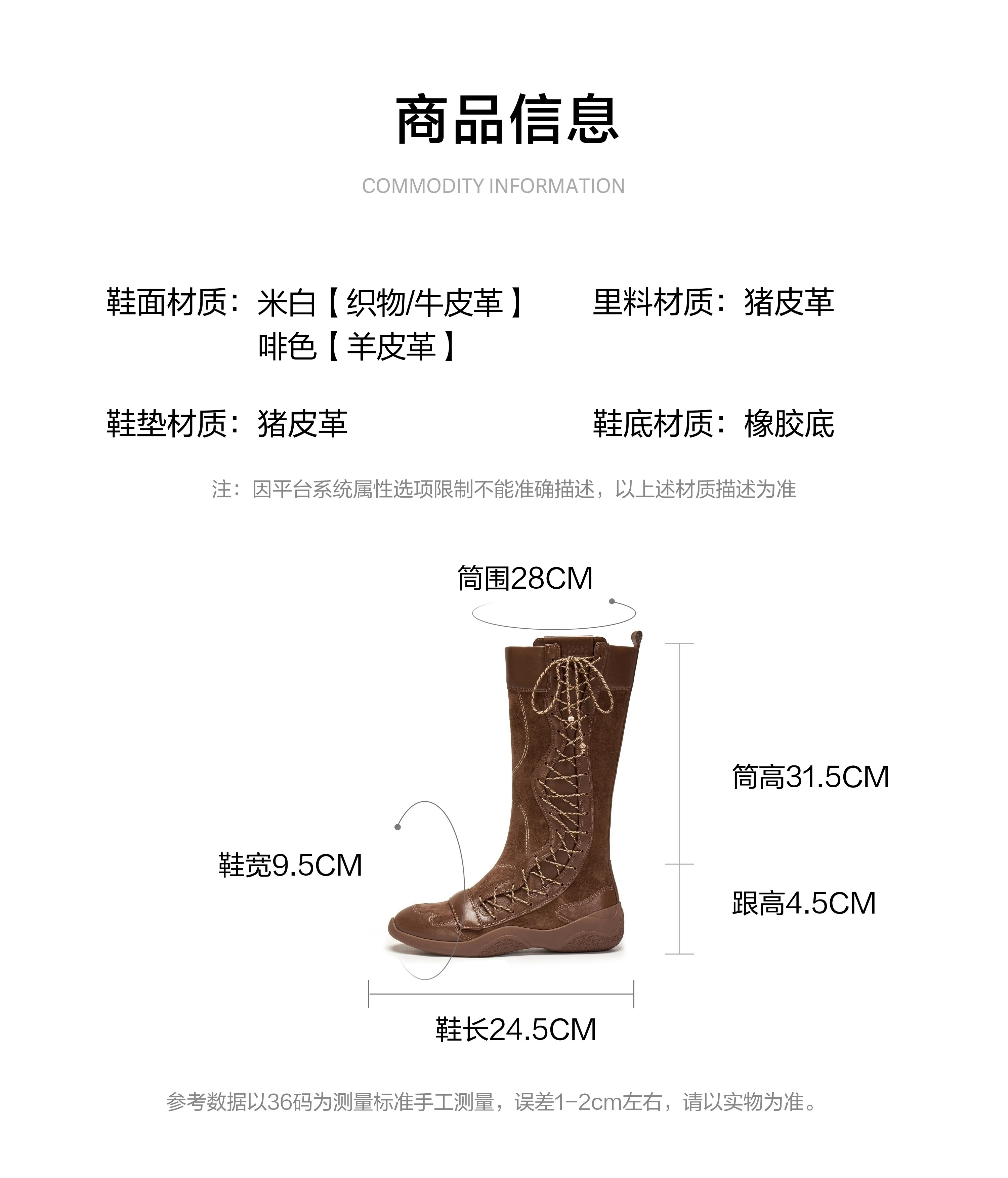 | 风格:帅气 | 鞋面内里材质:猪皮革 | 色系:咖啡色 | 跟高数值:4.5CM | 筒高数值:31.5CM |