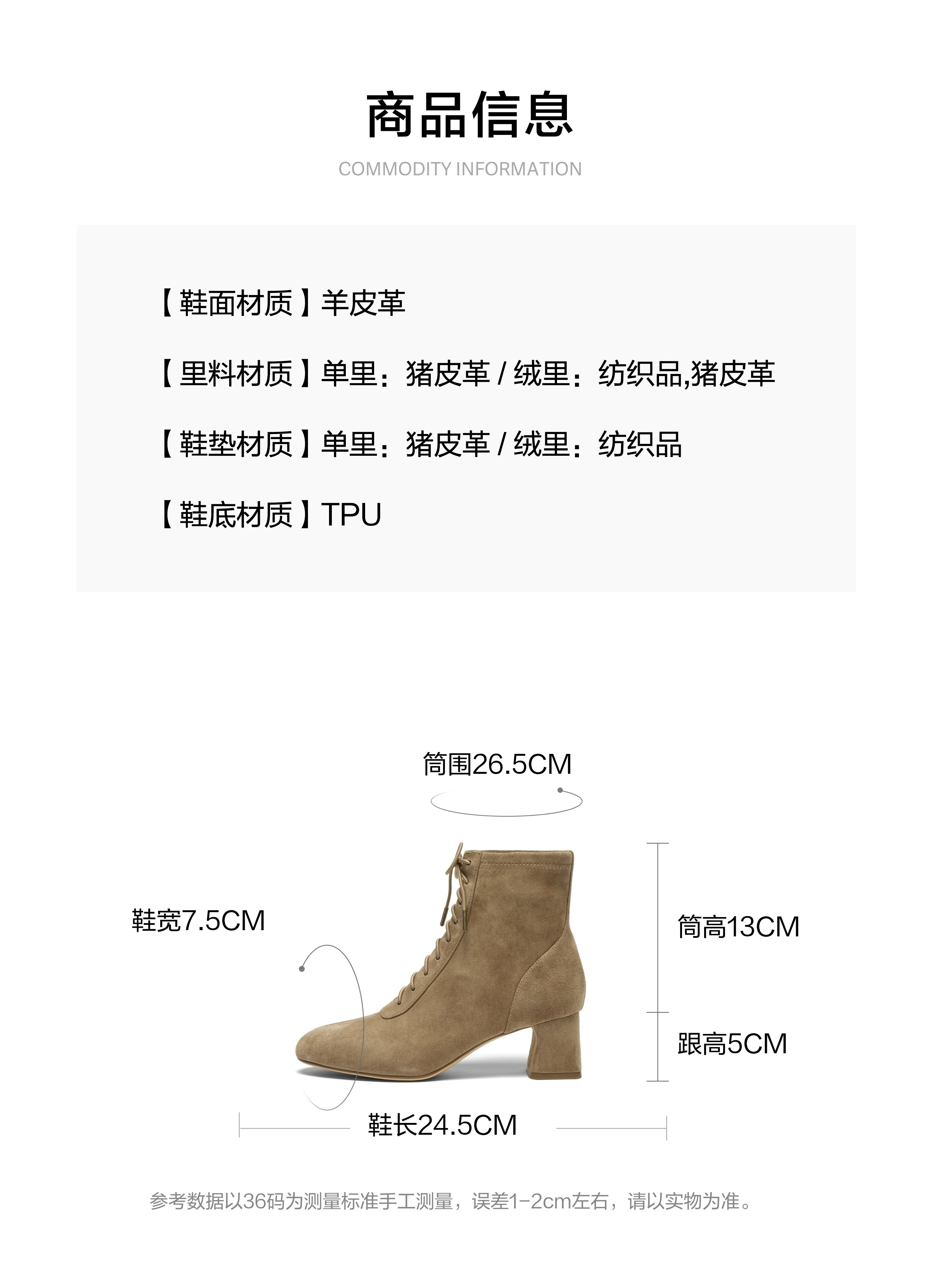 | 参考标准尺码:36码 | 跟高数值:5CM | 筒高数值:13CM | 性别:女子 | 靴筒筒面材质:羊皮革 |