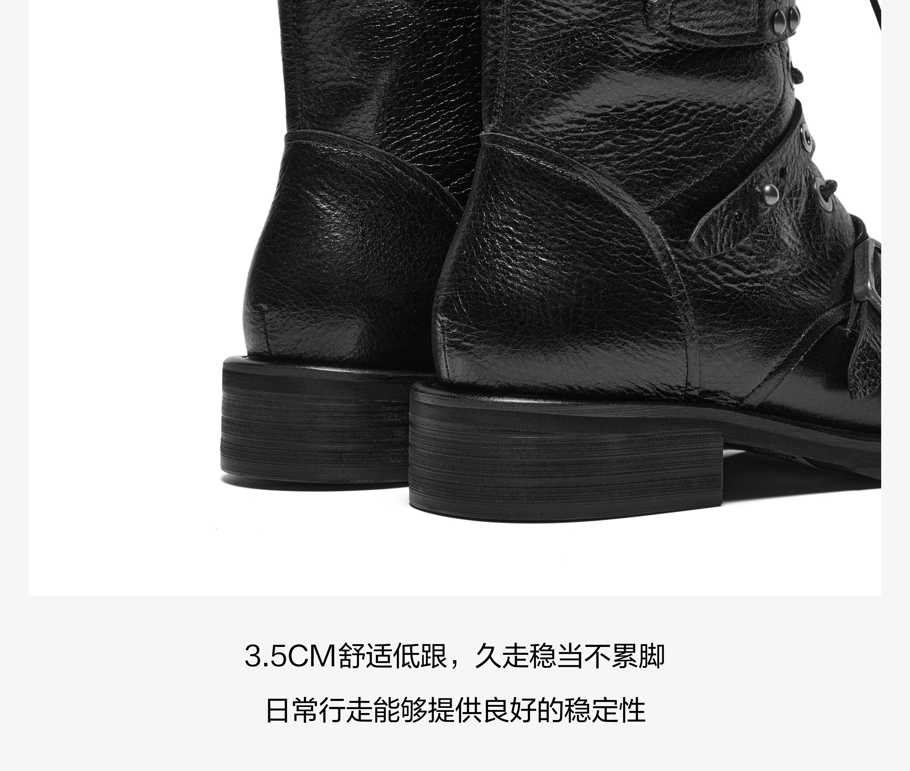 | 风格:帅气 | 鞋面内里材质:超纤猪皮革 | 色系:黑色 | 跟高数值:3.5CM | 筒高数值:23CM |