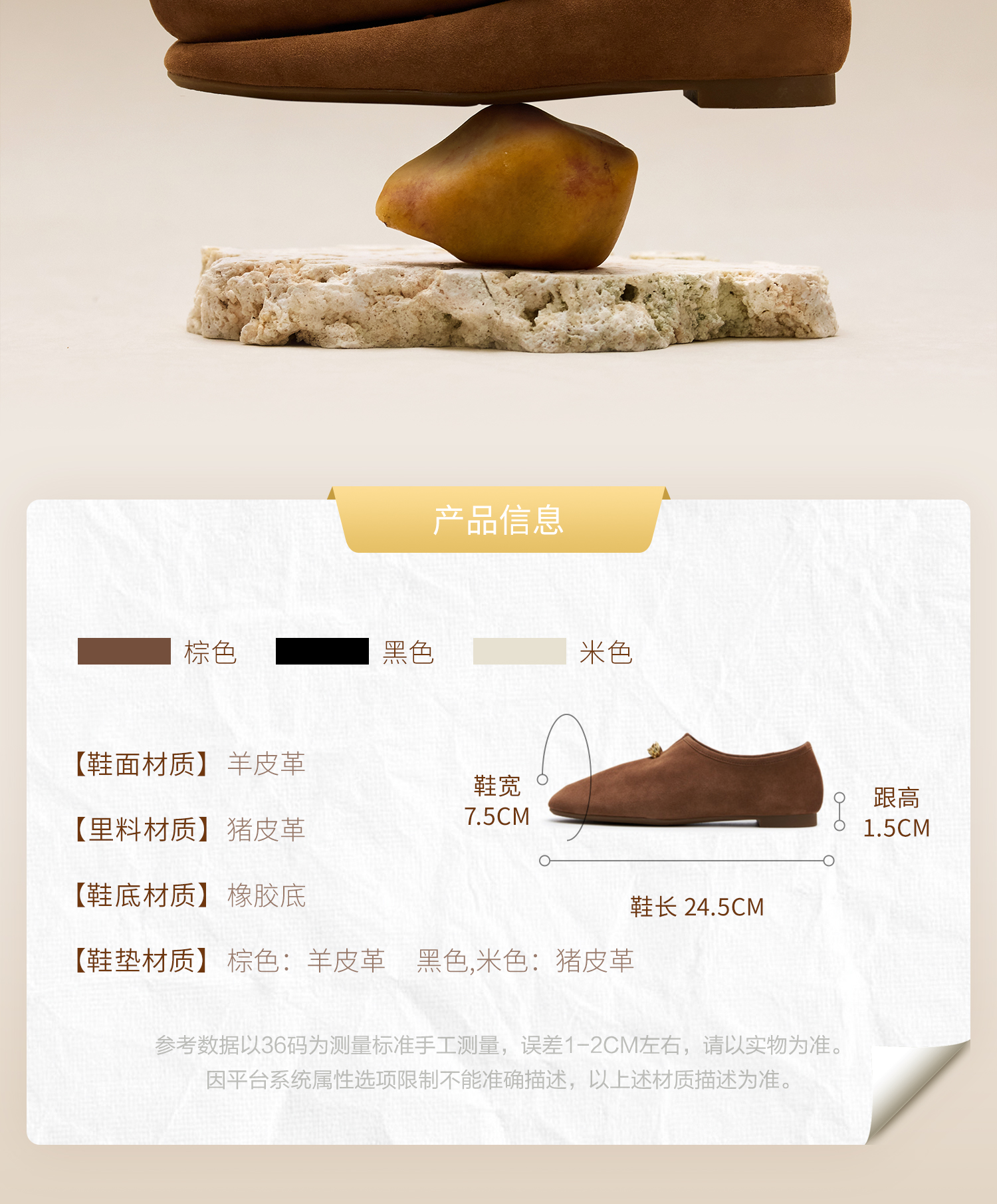 | 制鞋工艺:车线胶粘 | 鞋垫材质:猪皮革 | 款式季节:春季 | 皮质特征:羊皮革 | 前掌高度:0.5CM |