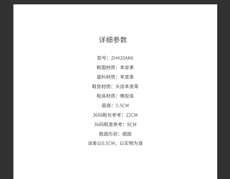 | 鞋头款式:尖头 | 鞋底材质:橡胶底 | 鞋面图案:纯色 | 鞋跟形状:细跟 | 鞋面材质:羊皮革 |