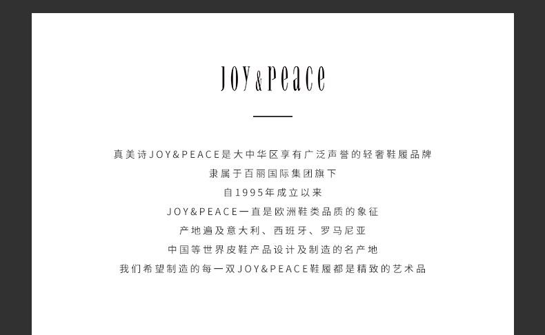 JOY & PEACE(真美诗),品牌于1995年成立于香港,隶属于百丽国际集团,23年以来一直是大中华地区欧洲女鞋的代表品牌。JOY & PEACE致力于将源自意大利的制鞋工艺与时尚设计服务于每位女性。目前JOY & PEACE开设线下门店达400多家,覆盖香港、澳门、中国大陆及马来西亚等100多个城市。