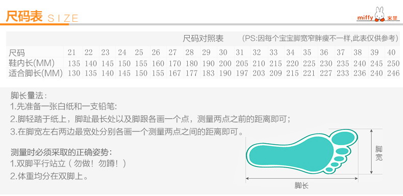 | 尺码 | 21 | 22 | 23 | 24 | 25 | 26 | 27 | 28 | 29 | 30 | 31 | 32 | 33 | 34 | 35 | 36 | 37 | 38 | 39 | 40 |