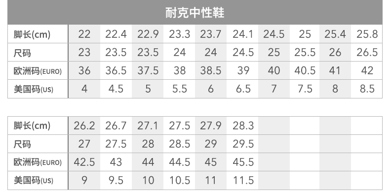 | 脚长(厘米) | 22 | 22.4 | 22.9 | 23.3 | 23.7 | 24.1 | 24.5 | 25 | 25.4 | 25.8 | 26.2 | 26.7 | 27.1 | 27.5 | 27.9 | 28.3 |