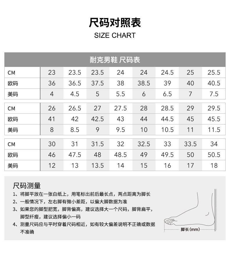 | CM | 23 | 23.5 | 23.5 | 24 | 24 | 24.5 | 25 | 25.5 | 26 | 26.5 | 27 | 27.5 | 28 | 28.5 | 29 | 29.5 | 30 | 31 | 31.5 | 32 | 32.5 | 33 | 33.5 | 34 |