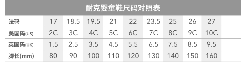 | 适合脚长(mm) | 80 | 90 | 100 | 110 | 120 | 130 | 140 | 150 | 160 |