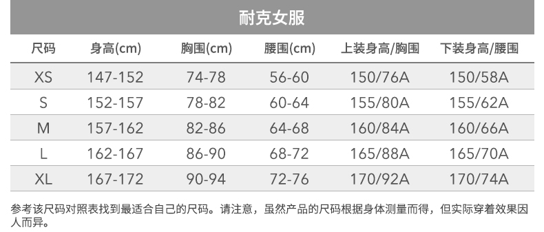 | 上装身高/胸围 | 150/76A | 155/80A | 160/84A | 165/88A | 170/92A |