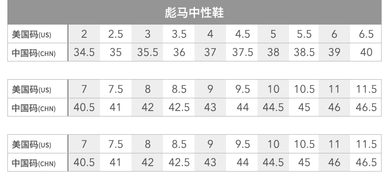 | 欧码(EUR) | 34.5 | 35 | 35.5 | 36 | 37 | 37.5 | 38 | 38.5 | 39 | 40 | 40.5 | 41 | 42 | 42.5 | 43 | 44 | 44.5 | 45 |