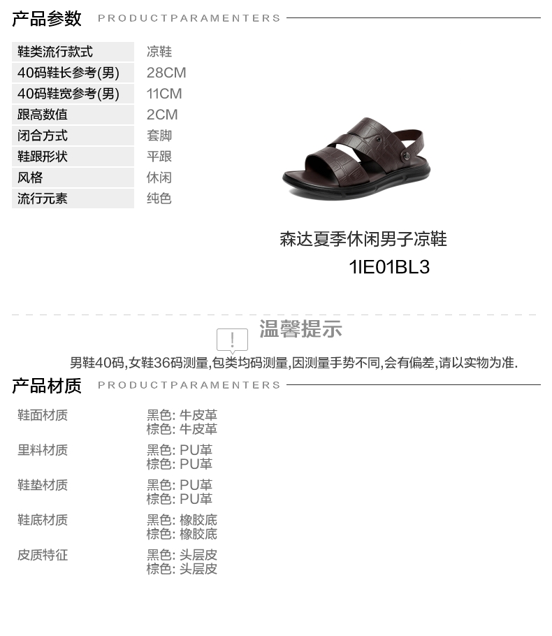 | 所在区域:电子商务 | 40码鞋宽参考(男):11CM | 性别:男子 | 风格分类:皮凉鞋皮凉鞋 | 里料材质:PU革 |