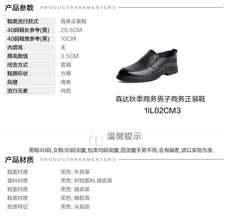 | 风格:商务 | 色系:黑色 | 跟高数值:3.5CM | 40码鞋宽参考(男):10CM | 性别:男子 |