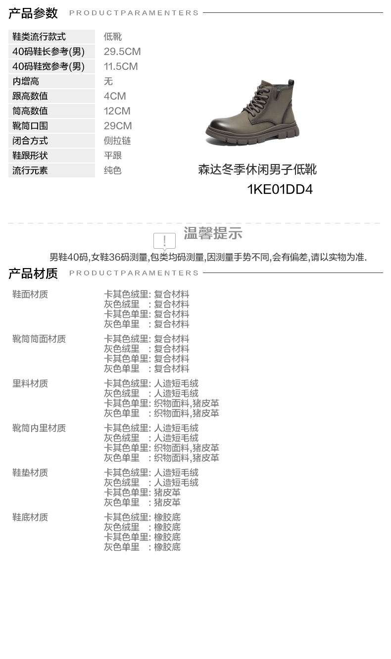 | 闭合方式:侧拉链 | 40码鞋宽参考(男):11.5CM | 靴筒口围:29CM | 上市时间:2024年冬季 | 鞋类流行款式:低靴 |