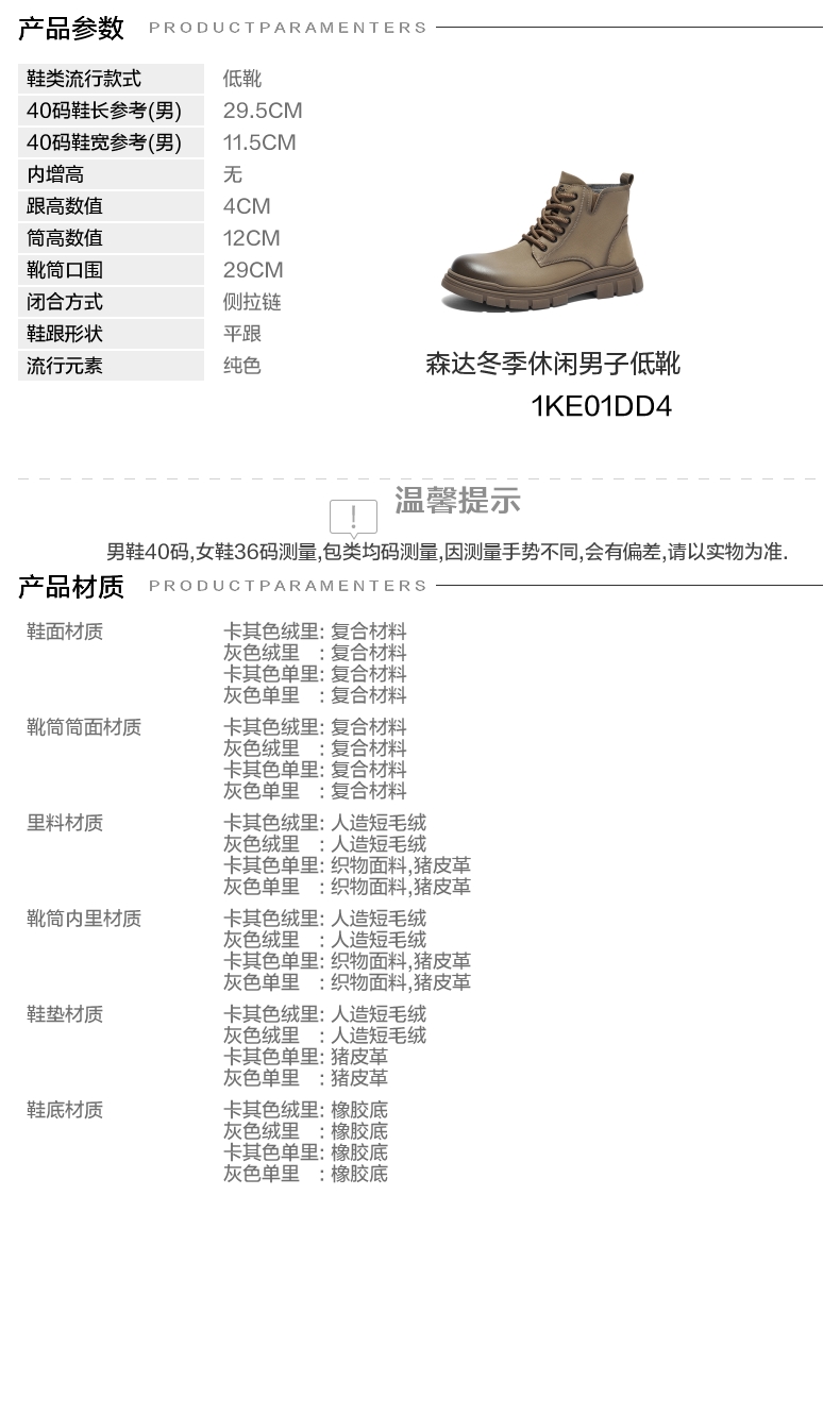 | 闭合方式:侧拉链 | 40码鞋宽参考(男):11.5CM | 靴筒口围:29CM | 上市时间:2024年冬季 | 鞋类流行款式:低靴 |