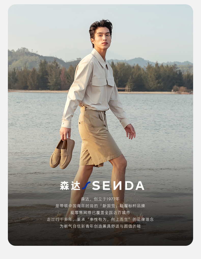 SENDA(森达),品牌成立于1977年,拥有40年发展史,秉承舒适的制鞋理念,从用料到工艺都经过严格质量把控。男鞋以舒适质感著称,覆盖商务正装、商务休闲、时尚休闲三大系列,适用不同场合的需求,同时开发摩克、加州等一系列功能性鞋履,行走体验;女鞋以款式优雅、穿着舒适为主要特征,依时尚潮流添加当季设计元素,每季推出时尚、休闲等系列鞋款,为都市白领提供不同场合的搭配需求。目前门店已覆盖近百座城市,数量达1800多家。