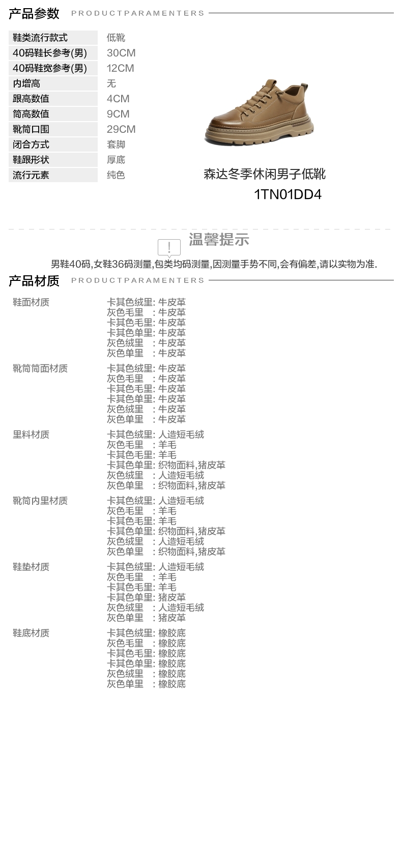 | 靴筒口围:29CM | 风格分类:工装靴 | 上市时间:2024年冬季 | 生产/经销/进口厂家:江苏新森达鞋业有限公司 | 鞋类流行款式:低靴 |