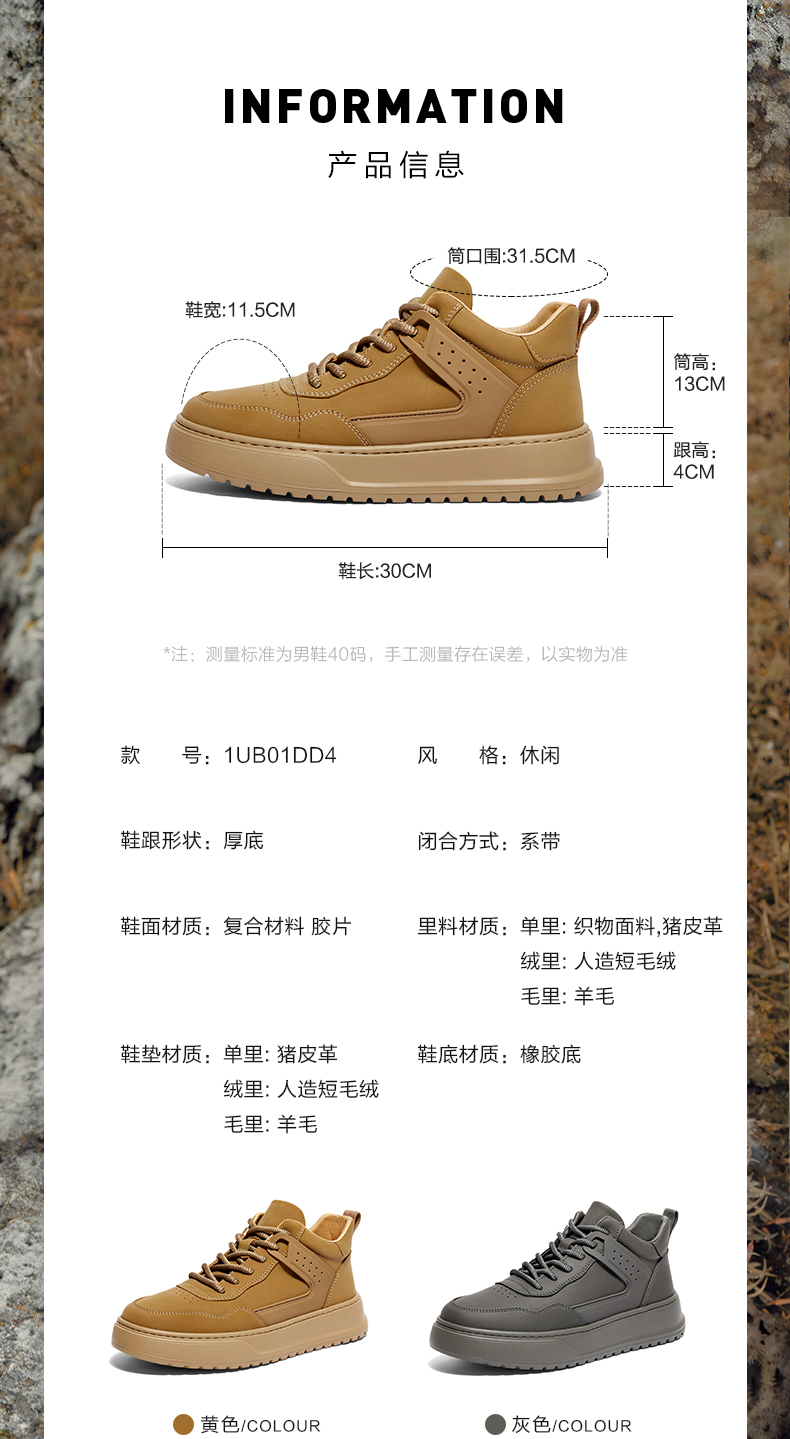 | 闭合方式:系带 | 40码鞋宽参考(男):11.5CM | 靴筒口围:31.5CM | 上市时间:2024年冬季 | 鞋类流行款式:低靴 |