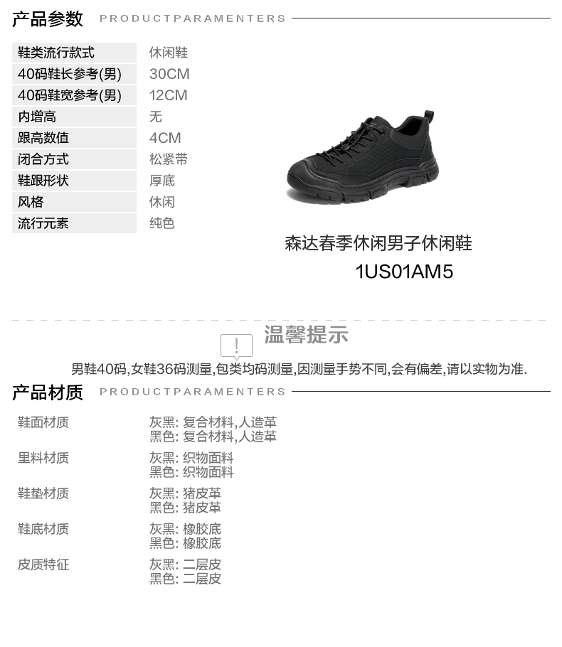 | 风格:休闲 | 色系:黑色 | 跟高数值:4CM | 40码鞋宽参考(男):12CM | 性别:男子 |