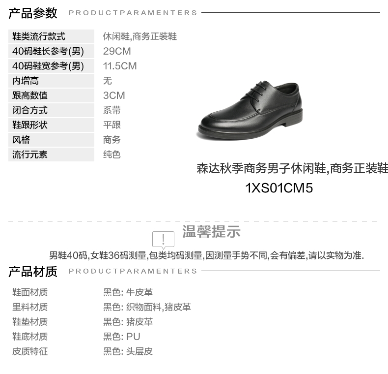 | 风格:商务 | 色系:黑色 | 跟高数值:3CM | 40码鞋宽参考(男):11.5CM | 性别:男子 |