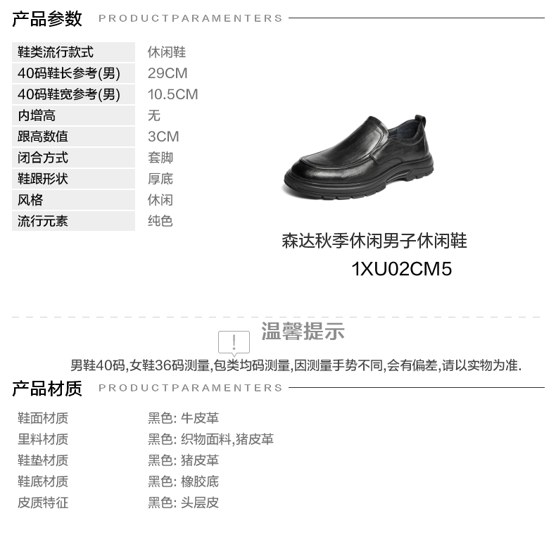 | 风格:休闲 | 色系:黑色 | 跟高数值:3CM | 40码鞋宽参考(男):10.5CM | 性别:男子 |