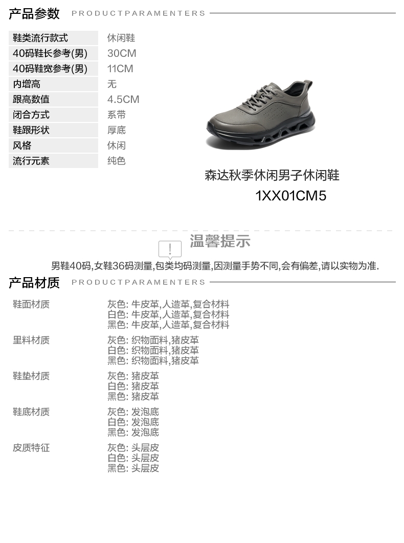 | 风格:休闲 | 色系:灰色 | 跟高数值:4.5CM | 40码鞋宽参考(男):11CM | 性别:男子 |