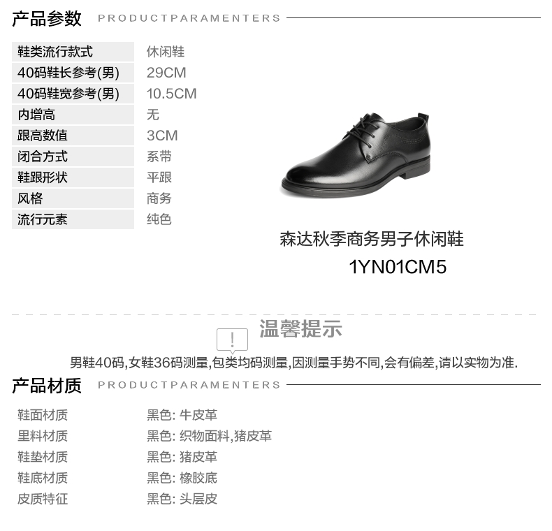 | 色系:黑色 | 跟高数值:3CM | 40码鞋宽参考(男):10.5CM | 性别:男子 | 里料材质:织物面料猪皮革 |