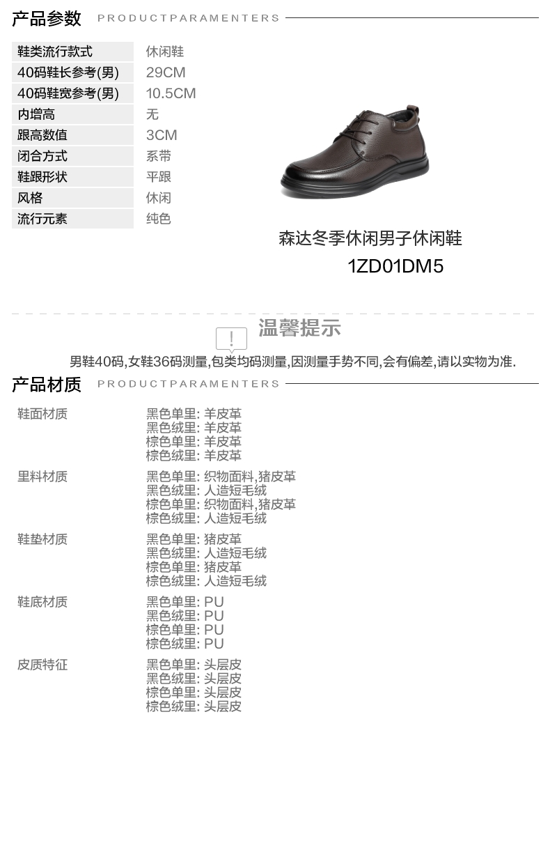 | 闭合方式:系带 | 风格:休闲 | 色系:棕色 | 跟高数值:3CM | 40码鞋宽参考(男):10.5CM |
