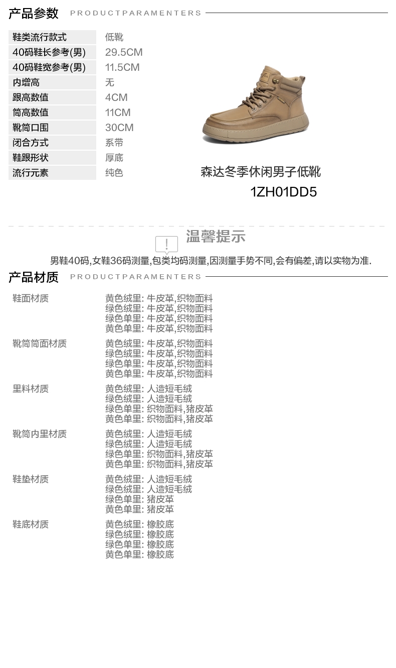| 闭合方式:系带 | 40码鞋宽参考(男):11.5CM | 靴筒口围:30CM | 上市时间:2025年冬季 | 鞋类流行款式:低靴 |