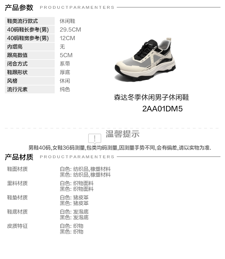 | 风格:休闲 | 色系:白色 | 跟高数值:5CM | 40码鞋宽参考(男):12CM | 性别:男子 |