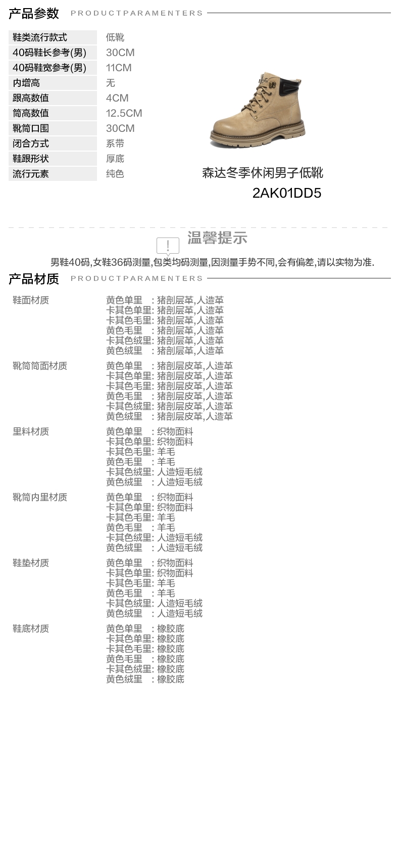 | 闭合方式:系带 | 40码鞋宽参考(男):11CM | 靴筒口围:30CM | 上市时间:2025年冬季 | 鞋类流行款式:低靴 |