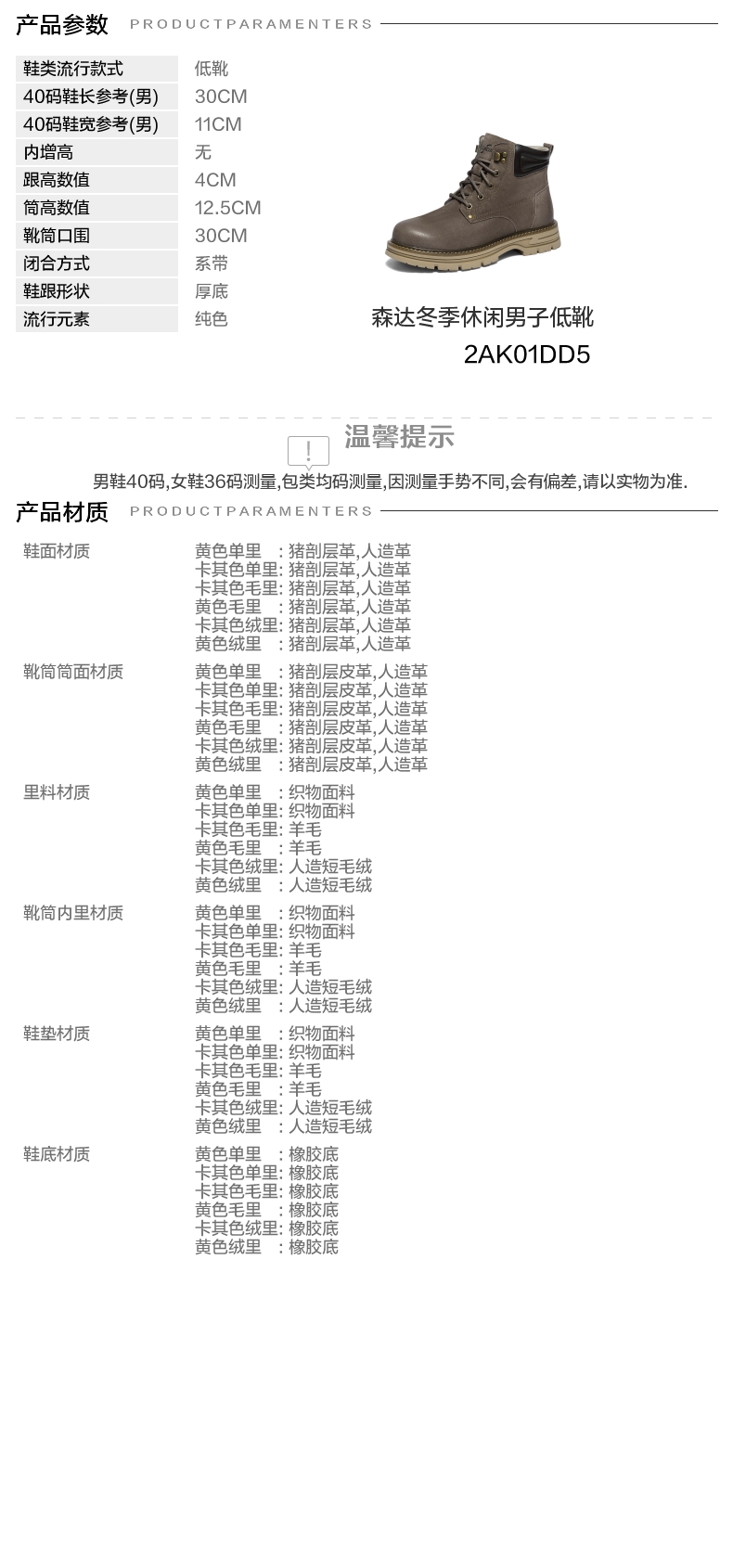 | 闭合方式:系带 | 40码鞋宽参考(男):11CM | 靴筒口围:30CM | 上市时间:2025年冬季 | 鞋类流行款式:低靴 |