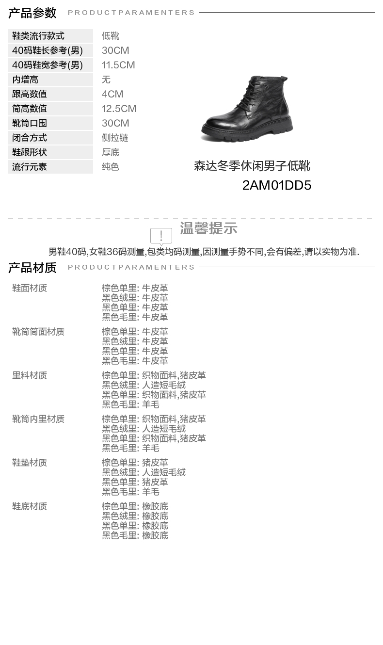 | 闭合方式:侧拉链 | 40码鞋宽参考(男):11.5CM | 靴筒口围:30CM | 上市时间:2025年冬季 | 鞋类流行款式:低靴 |
