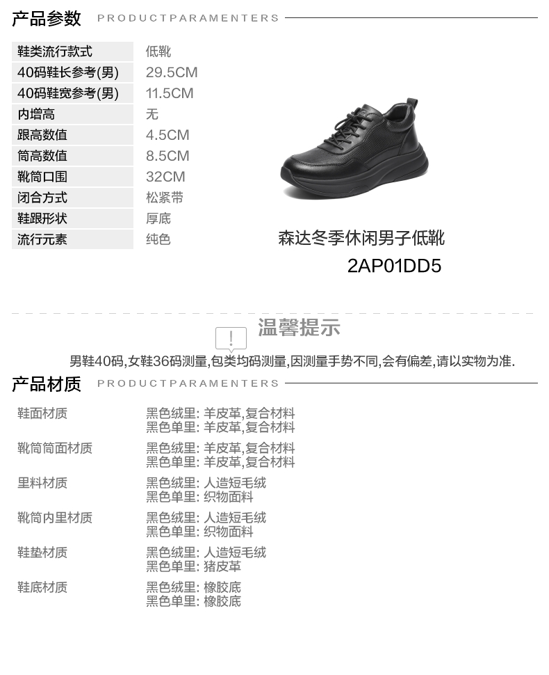 | 闭合方式:松紧带 | 40码鞋宽参考(男):11.5CM | 靴筒口围:32CM | 上市时间:2025年冬季 | 鞋类流行款式:低靴 |