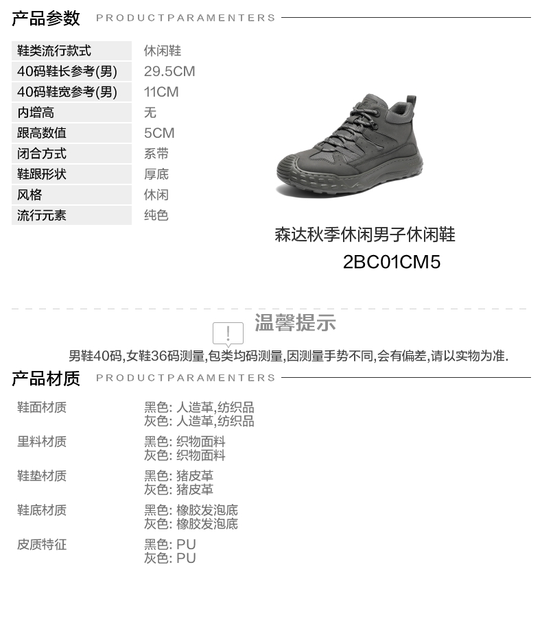| 风格:休闲 | 色系:灰色 | 跟高数值:5CM | 40码鞋宽参考(男):11CM | 性别:男子 |