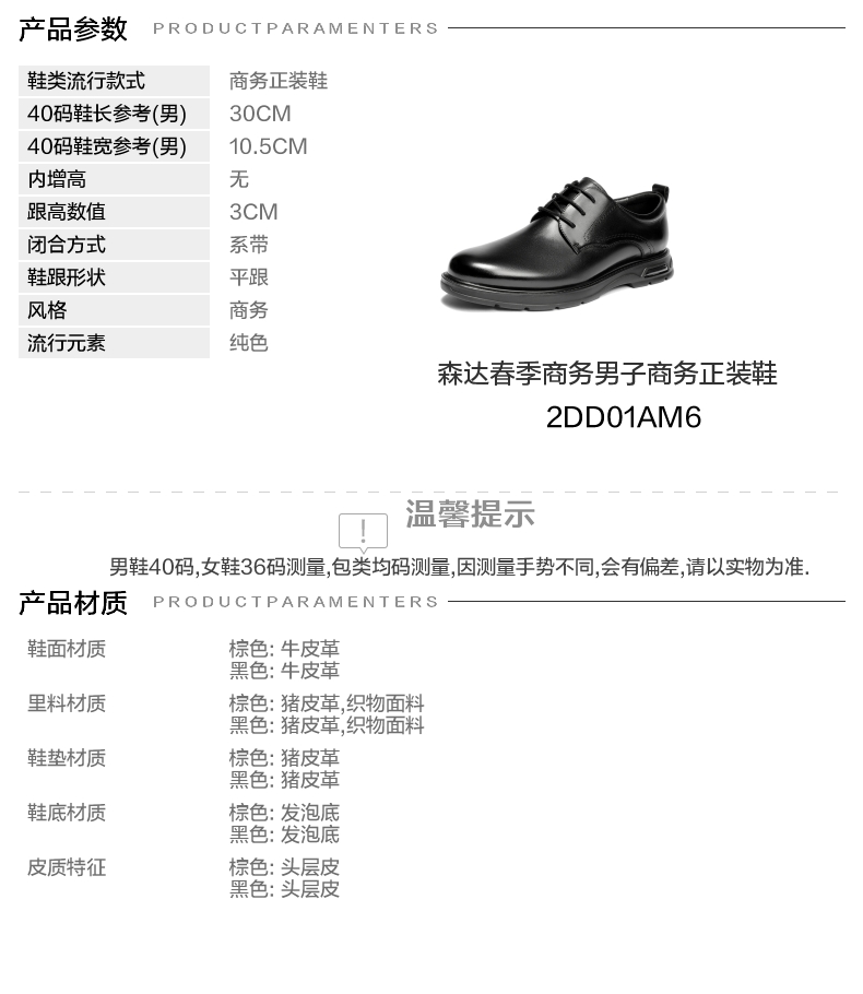 | 风格:商务 | 色系:黑色 | 跟高数值:3CM | 40码鞋宽参考(男):10.5CM | 性别:男子 |