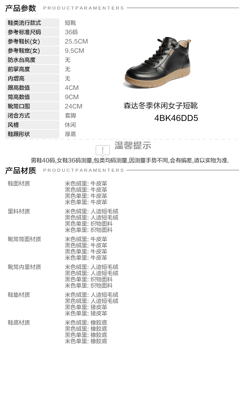 | 参考鞋宽(女):9.5CM | 风格:休闲 | 色系:黑色 | 跟高数值:4CM | 筒高数值:9CM |