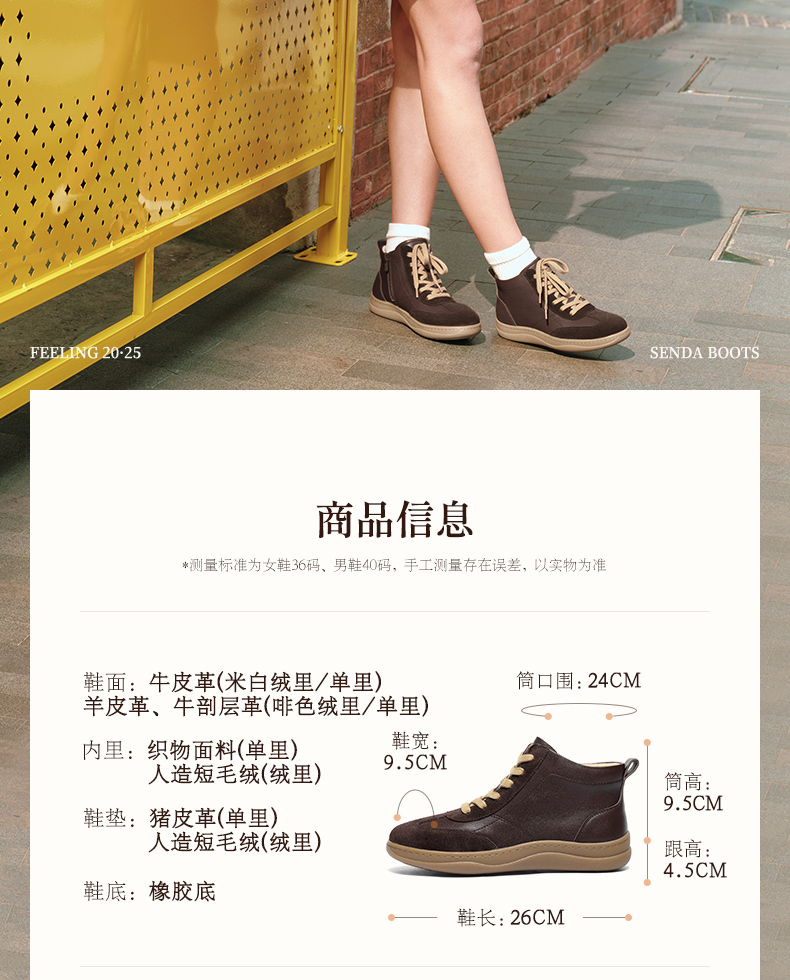| 帮面材质:牛剖层革羊皮 | 配跟:无 | 靴筒口围:24CM | 上市时间:2025年冬季 | 鞋类流行款式:短靴 |