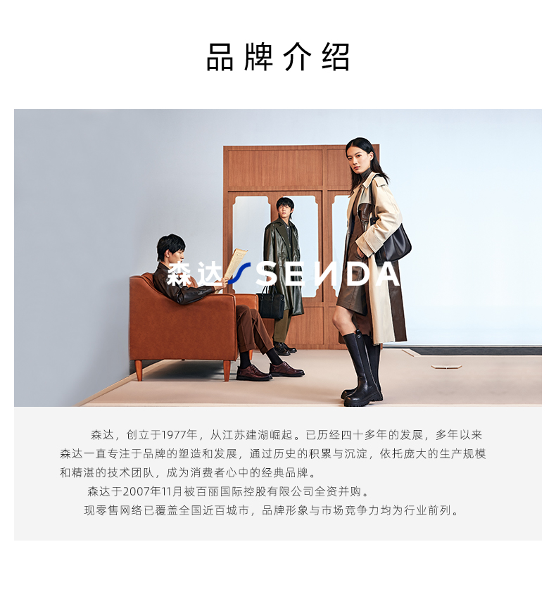 SENDA(森达),品牌成立于1977年,拥有40年发展史,秉承舒适的制鞋理念,从用料到工艺都经过严格质量把控。男鞋以舒适质感著称,覆盖商务正装、商务休闲、时尚休闲三大系列,适用不同场合的需求,同时开发摩克、加州等一系列功能性鞋履,行走体验;女鞋以款式优雅、穿着舒适为主要特征,依时尚潮流添加当季设计元素,每季推出时尚、休闲等系列鞋款,为都市白领提供不同场合的搭配需求。目前门店已覆盖近百座城市,数量达1800多家。