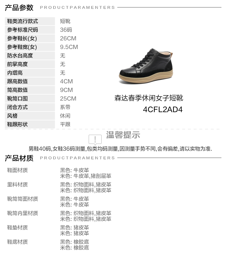 | 参考鞋宽(女):9.5CM | 风格:休闲 | 色系:黑色 | 跟高数值:4CM | 筒高数值:9CM |