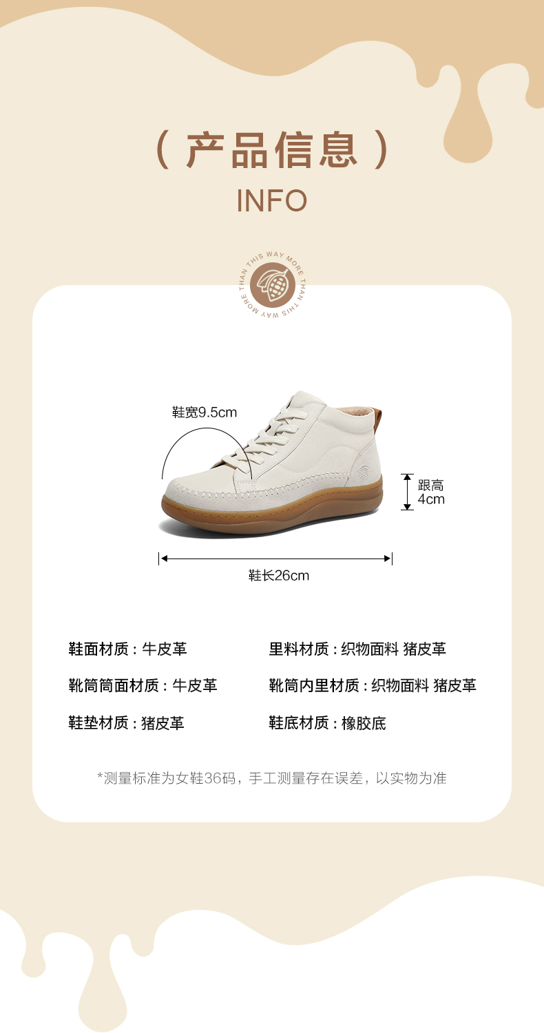| 鞋底材质:橡胶底 | 靴筒内里材质:猪皮革织物面料 | 内增高:无 | 鞋面材质:牛皮革 | 闭合方式:系带 |