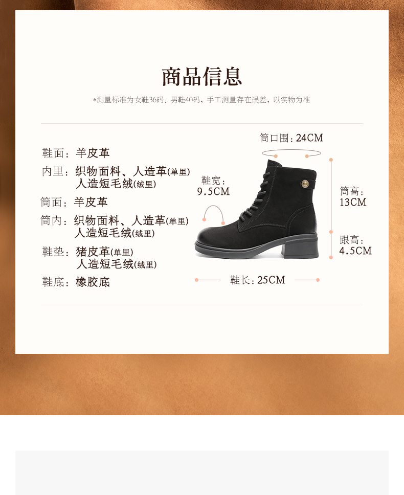 | 帮面材质:羊皮 | 配跟:无 | 靴筒口围:24CM | 上市时间:2025年冬季 | 鞋类流行款式:短靴 |