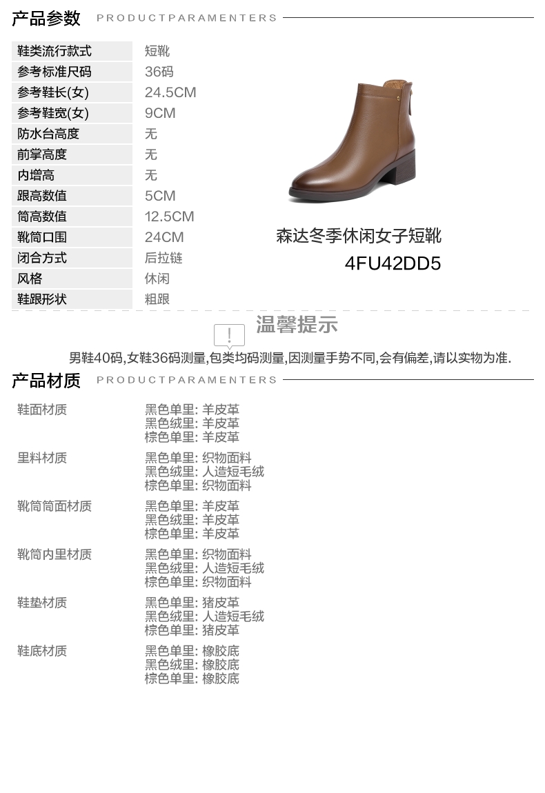 | 鞋底材质:橡胶底 | 靴筒内里材质:织物面料 | 内增高:无 | 鞋面材质:羊皮革 | 闭合方式:后拉链 |