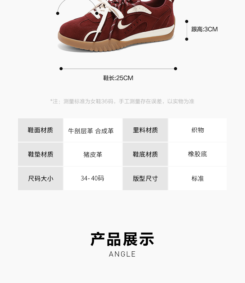 | 参考鞋长(女):25CM | 参考鞋宽(女):9.5CM | 风格:休闲 | 色系:啡色 | 参考标准尺码:36码 |