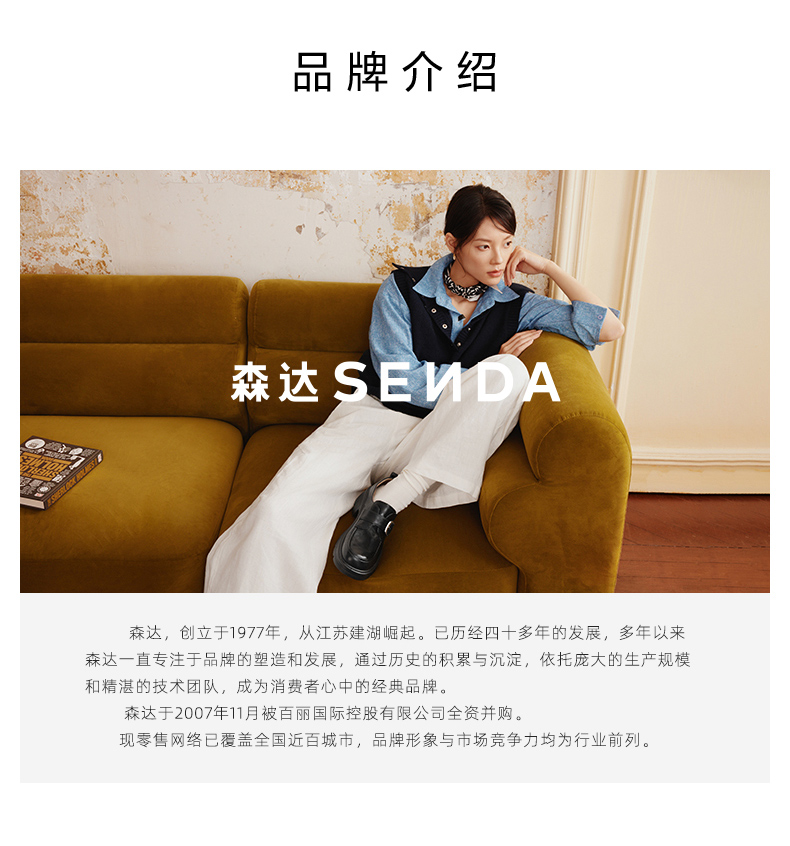 SENDA(森达),品牌成立于1977年,拥有40年发展史,秉承舒适的制鞋理念,从用料到工艺都经过严格质量把控。男鞋以舒适质感著称,覆盖商务正装、商务休闲、时尚休闲三大系列,适用不同场合的需求,同时开发摩克、加州等一系列功能性鞋履,行走体验;女鞋以款式优雅、穿着舒适为主要特征,依时尚潮流添加当季设计元素,每季推出时尚、休闲等系列鞋款,为都市白领提供不同场合的搭配需求。目前门店已覆盖近百座城市,数量达1800多家。