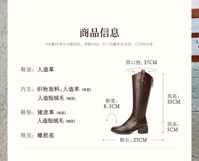 | 靴筒筒面材质:人造革 | 靴筒小腿围:36CM | 里料材质:人造革织物面料 | 制鞋工艺:胶贴皮鞋 | 鞋垫材质:猪皮革 |