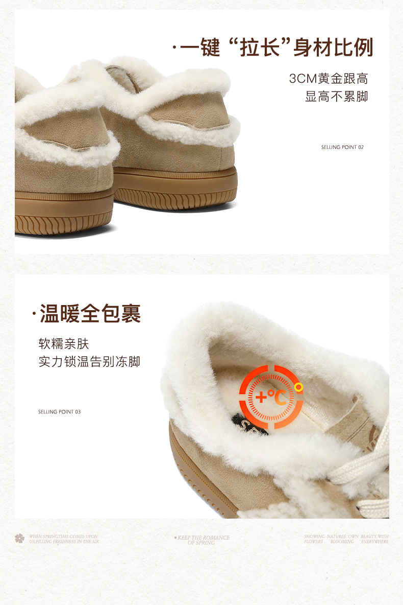 | 色系:杏色 | 跟高数值:3CM | 性别:女子 | 里料材质:人造长毛绒 | 制鞋工艺:胶贴皮鞋 |