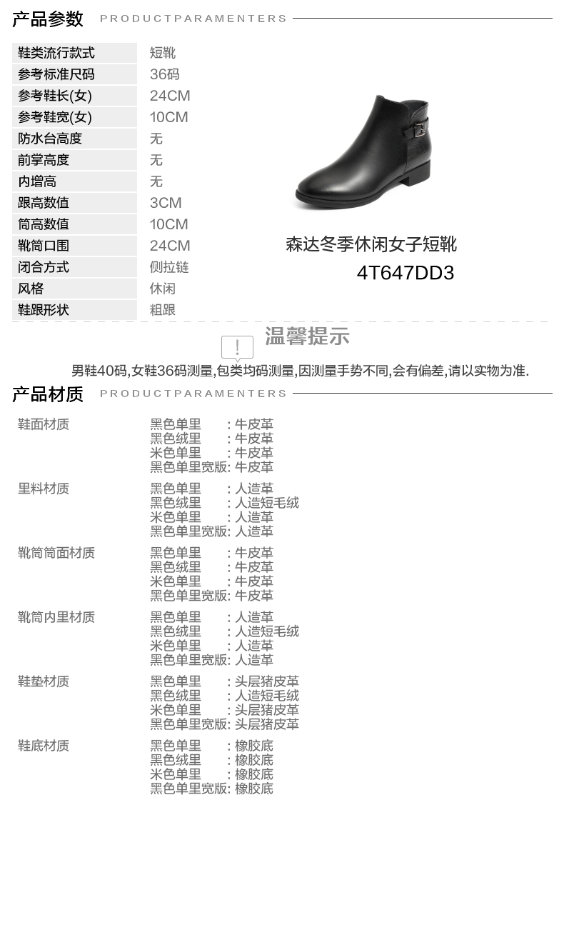 | 鞋底材质:橡胶底 | 靴筒内里材质:人造革 | 内增高:无 | 鞋面材质:牛皮革 | 闭合方式:侧拉链 |