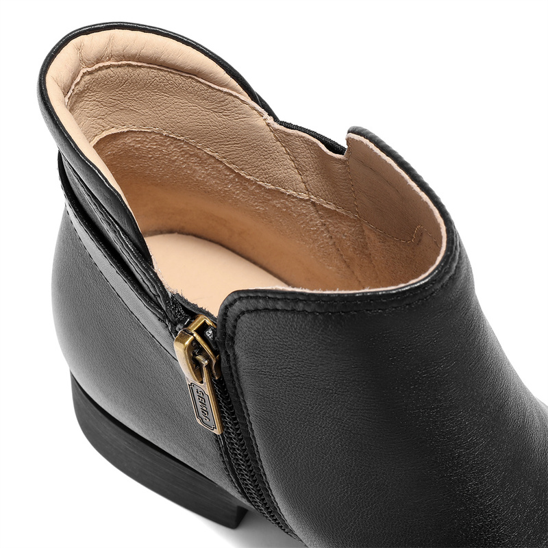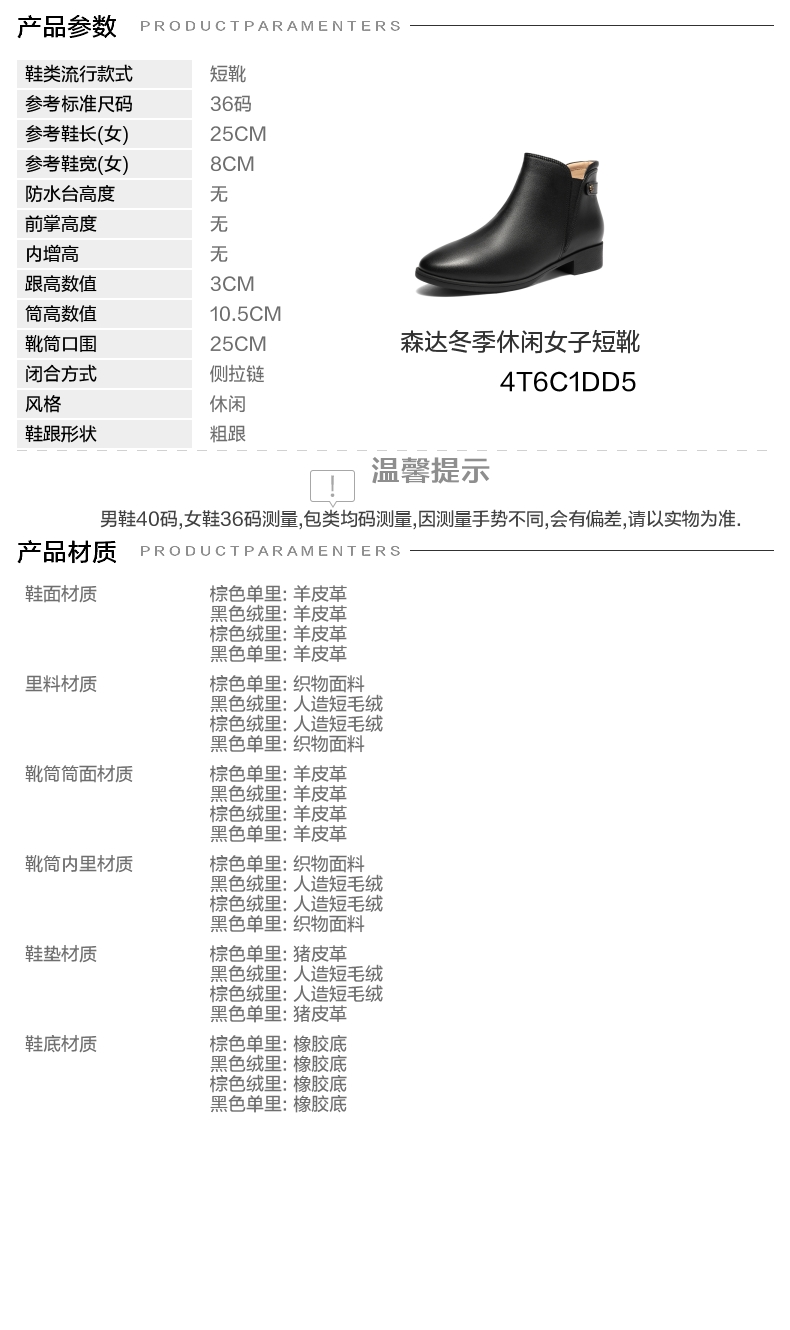| 鞋底材质:橡胶底 | 靴筒内里材质:织物面料 | 内增高:无 | 鞋面材质:羊皮革 | 闭合方式:侧拉链 |
